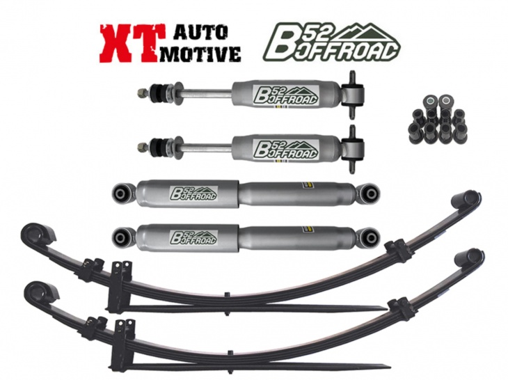 Lift kit B52 OFFROAD +5 cm:-2 XTAUTOMOTIVE leaf springs-4 B52 long travel shocks-kit poly bushesimproved handling and control ON and OFF-ROADXT AUTOMOTIVE LEAF SPRINGS: made from high quality steel, providing raised height and flexible ride. Termal treatment, shot peened for reduced stress and improved durability and qualityB52 shocks nitrogen gas pressurised:the advantages of B52 shocks:-low pressure nitrogen gas drammatically reduces the likelihood of oil aeration and shock fade-54mm body diameter-35mm piston-16mm rod-high strengh rubber bushes-fusion welded and supplementary welded mounts for maximun strengh and reliability-specially valved for each vehicle applicationFOR MITSUBISHI PAJERO LEAF SPRINGS FROM 1984 TO 1989