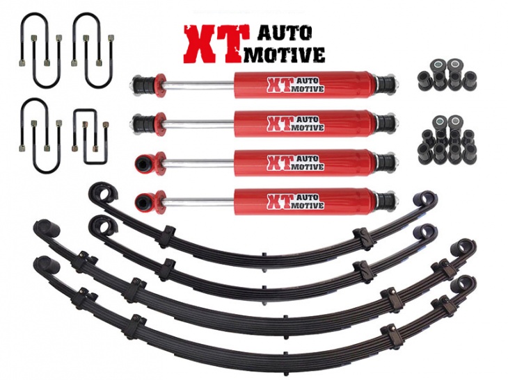 Lift Kit XT AUTOMOTIVE + 5 cm:- 4 XT AUTOMOTIVE leaf springs- 4 XT AUTOMOTIVE long travel shocks- kit poly bushes- kit u boltimproved handling and control ON and OFF-ROADXT AUTOMOTIVE LEAF SPRINGS: made from high quality steel, providing raised height and flexible ride. Termal treatment, shot peened for reduced stress and improved durability and qualityXT AUTOMOTIVE SHOCKS, MADE IN ITALY with the highest quality standards, iso9001:2015 certified,THE ADVANTAGES OF XT AUTOMOTIVE SHOCKS:-exclusively Hydraulic, special high quality and high strenght fluid mainteins viscosity in extreme situations-double effect-twin tube design for protection from stone damage-velocity sensitive valving for fine tuning the suspension control-61mm body diameter-38mm piston, this allow an oil quantity increased than other shocks, to not allow over temperatures and fading.-20mm ROD-all around welded steam and increased weld on loop to improve strenght-high strengh rubber bushes-INTERNAL LOCK tested to 5000kg!…this LOCK prevents topping out!-REBUILDABLE!!! It’s possibile rebuld it or change setting damper with rebuildingMADE IN ITALY!!!FOR NISSAN PATROL 3.3 (ALL YEARS)
