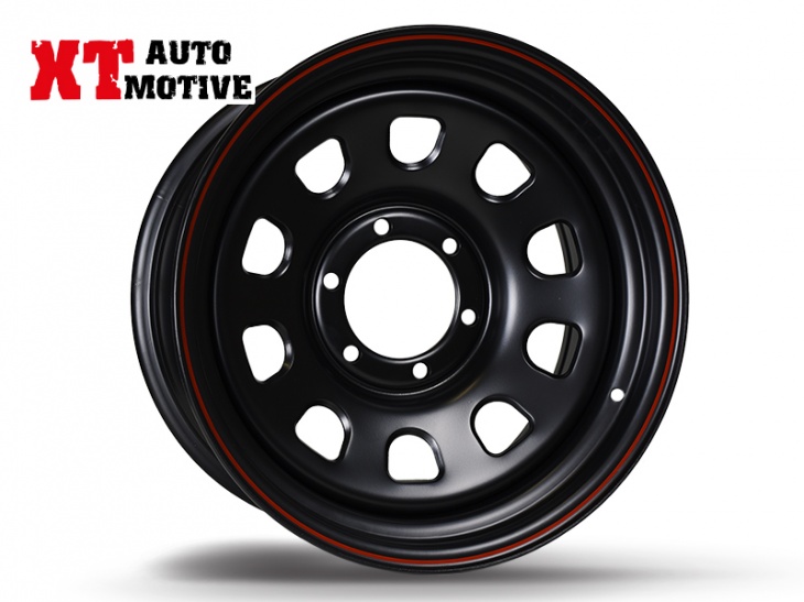 Steel wheel 8×17 Daytona mat black with red stripe, very strong for serious off-road.High quality steelTested and calibratedWith surface treatment for increased resistanceHigh resistance for off-roadSize: 8X17 ET-10 (6 holes)FOR FORD RANGER (ALL YEARS)NOTE: YOU NEED TO USE NUTS FOR STEEL RIMS